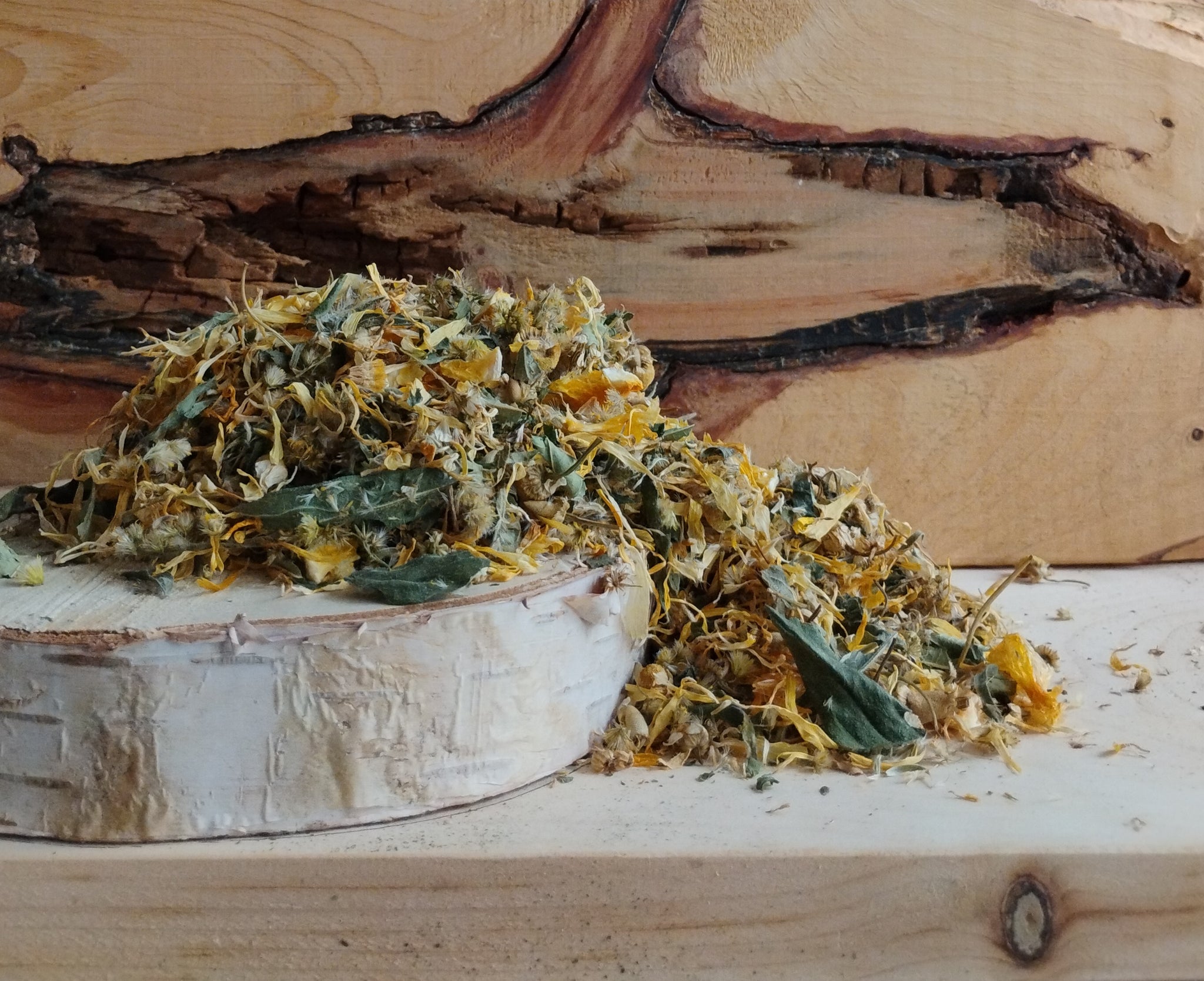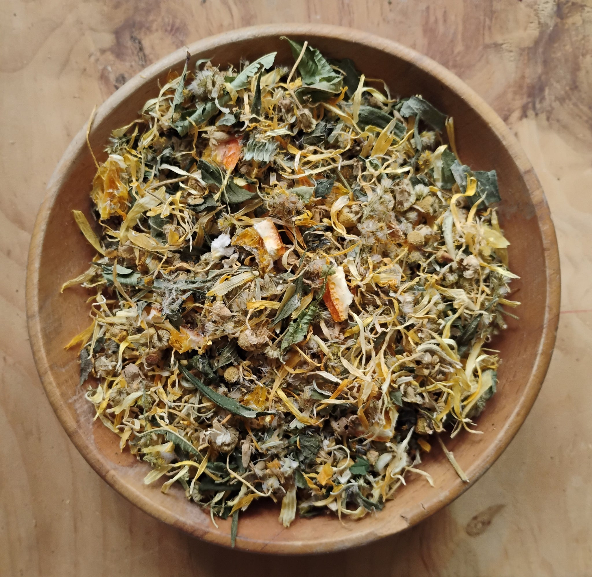 Ingrédients : Ortie du Canada*, Fleurs de Calendule, Feuilles et Fleurs de Verge d'Or*, Fleurs de Camomille*, Verveine citronnée, Écorces d'Orange