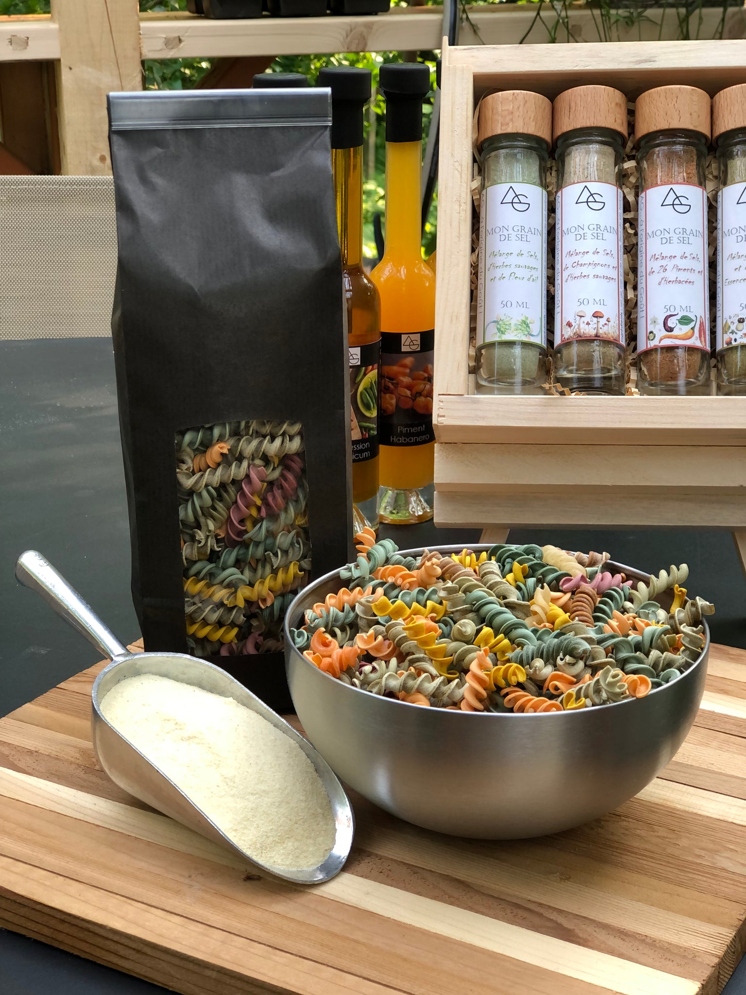 Extrudées à travers de matrices en bronze selon la tradition italienne, les pâtes signées AG se dégustent al dente. Confectionnées avec de la semoule durum certifiée biologique (La Milanaise) et de l'eau, elles sont agrémentées d'herbes et d'épices qui leur confèrent leur jolies couleurs.